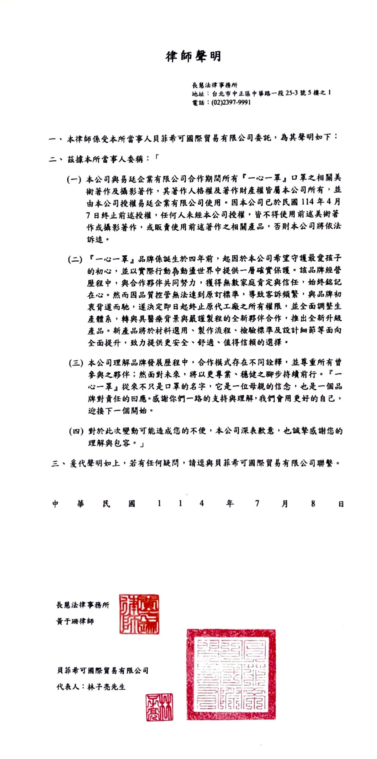 (三)品牌理解發展歷程中合作模式存在不同詮釋,尊重所有曾參與之夥伴;然面對未來,將以更專業、穩健之腳步持續前行。「一心一罩」從來不只是口罩的名字,它是一位母親的信念,也是一個品牌對責任的回應。感謝你們一路的支持與理解,我們會用更好的自己,迎接下一個開始。