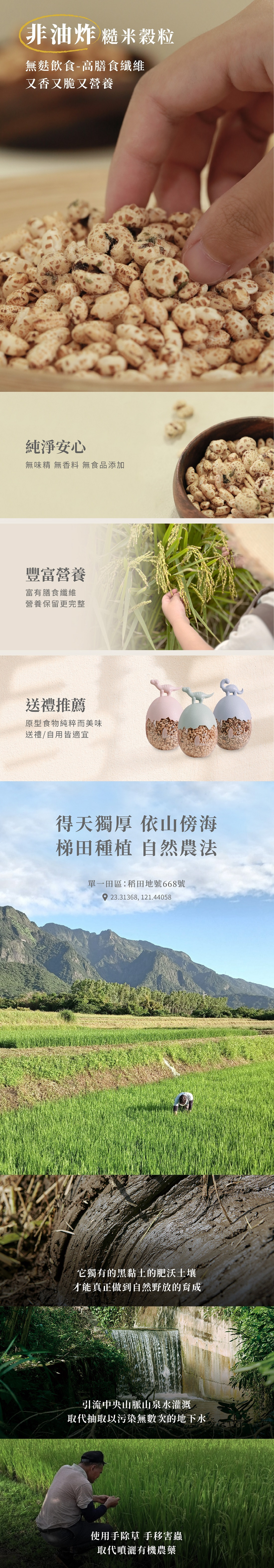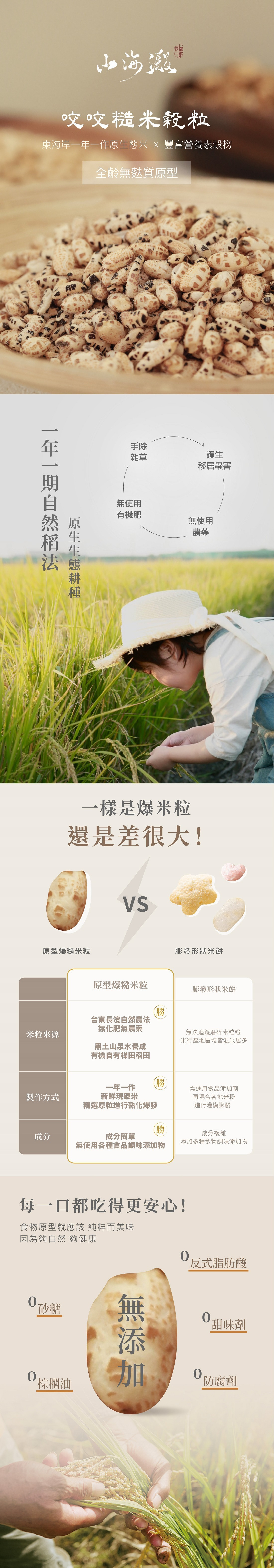以糙米粒與黒糙米粒,搭配穀物經過傳統爆米香手法,使其酥脆不嗑牙,綿密香氣噗鼻,適合1歲以上嬰幼兒。也可讓銀髮族當作沖泡式穀物,取代傳統麥片,更是無麩質的新型態食品!