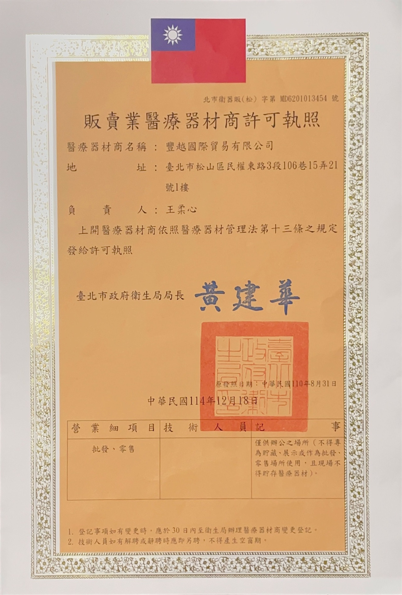 許可執照字號:北市衛器販(松)字第MD6201013454號。