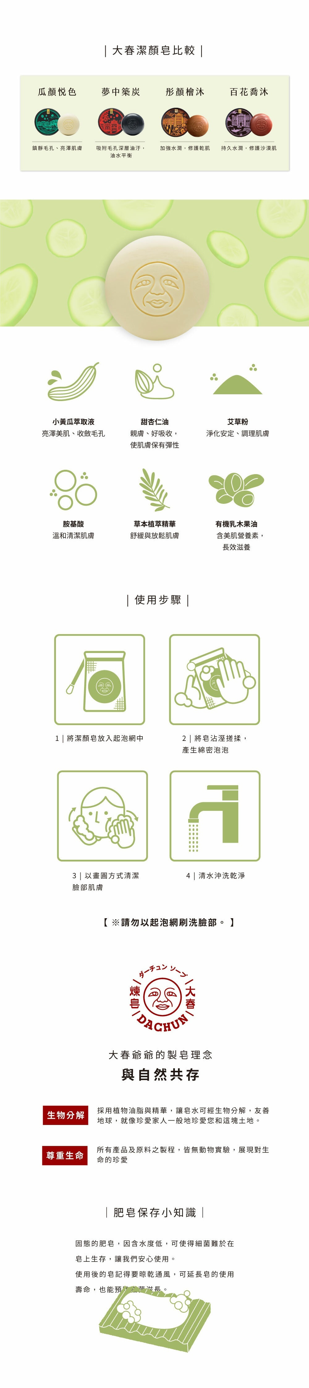 棕櫚油、棕櫚核仁油、胺基酸、有機乳木果油、甜杏仁油、艾草粉、小黃瓜萃取、草本植萃精華。