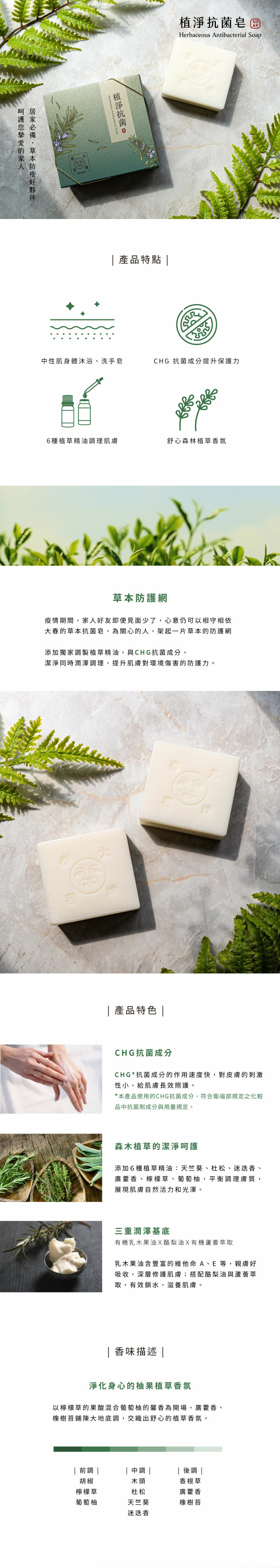 棕櫚油、棕櫚核仁油、荷荷芭酯、葡萄柚精油、有機乳木果油、大豆卵磷脂、酪梨油、CHG抗菌成分、天竺葵精油、大豆油、廣藿香精油、迷迭香精油、杜松精油、檸檬草精油、薑精油、小茴香精油、蘆薈萃取。