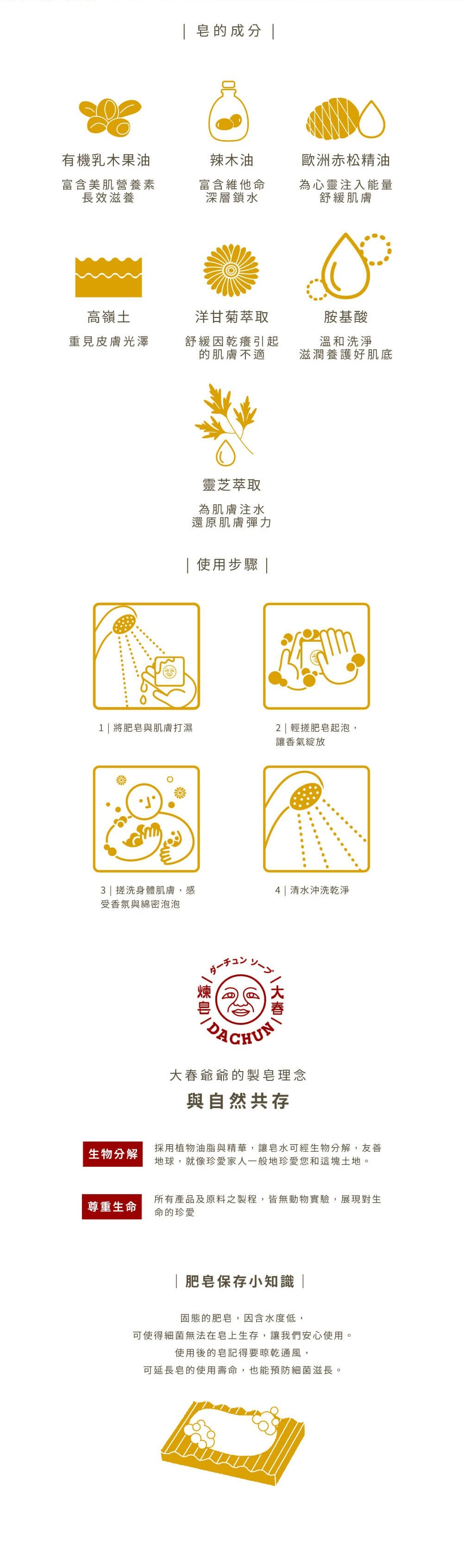 棕櫚油、棕櫚核仁油、甘油、辣木油、有機乳木果油、荷荷芭酯、胺基酸、高嶺土、歐洲赤松精油、靈芝萃取、洋甘菊萃取。