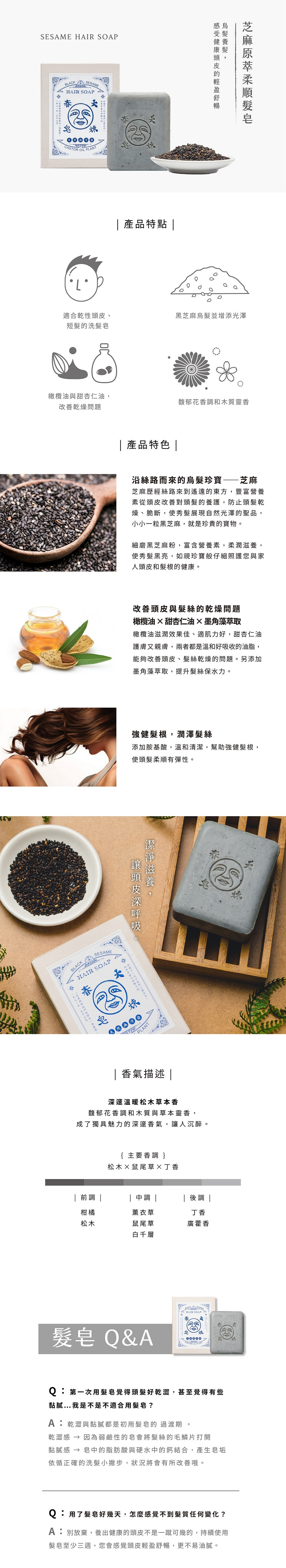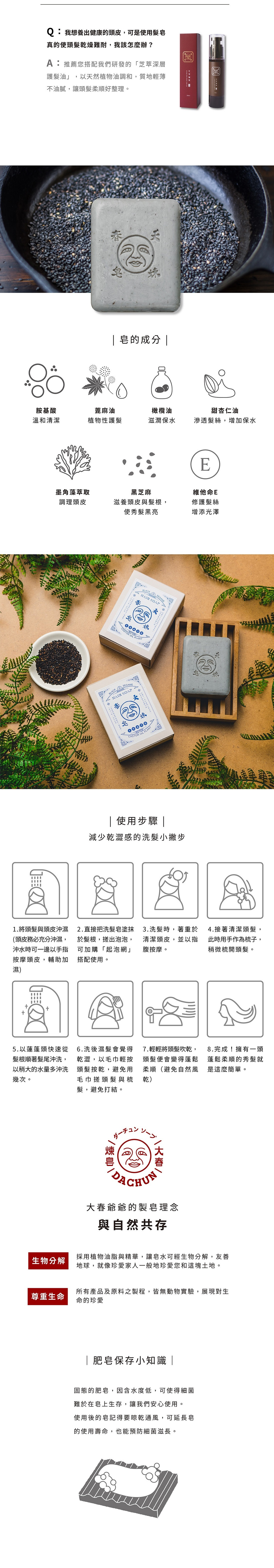 棕櫚油、棕櫚核仁油、蓖麻油、胺基酸、黑芝麻、橄欖油、甜杏仁油、墨角藻萃取。