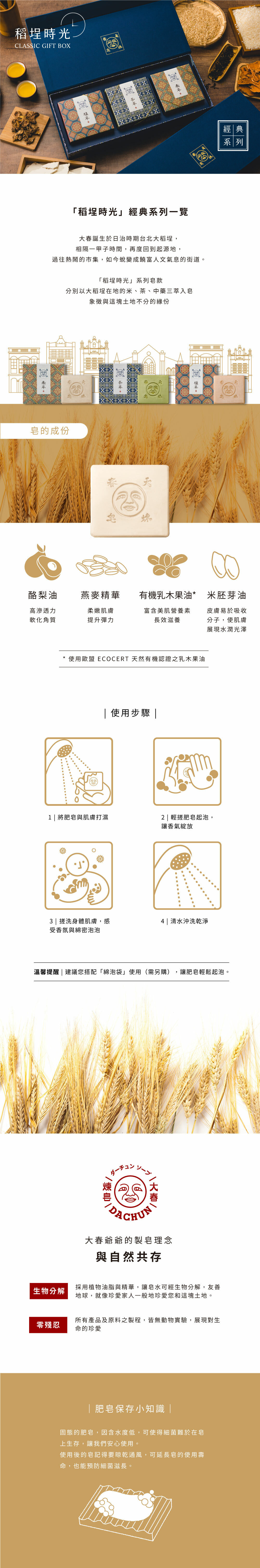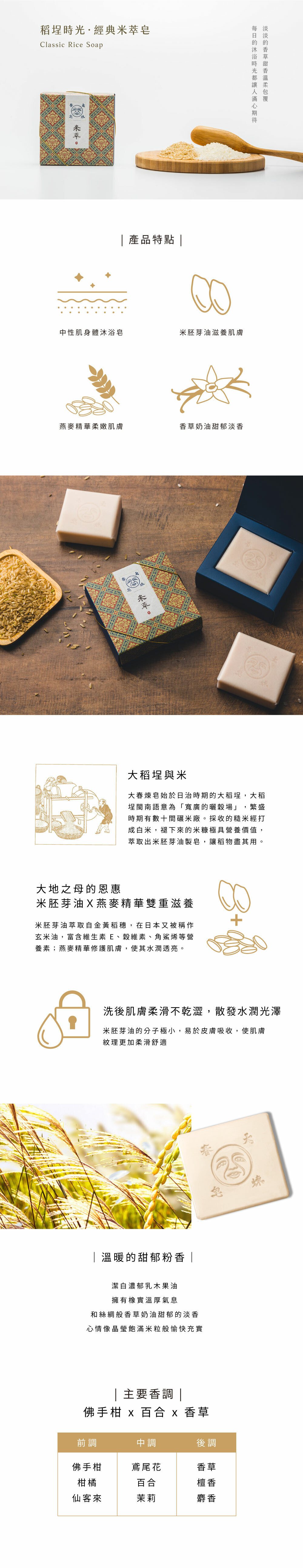 棕櫚油、棕櫚核仁油、米胚芽油、有機乳木果油、酪梨油、燕麥精華。